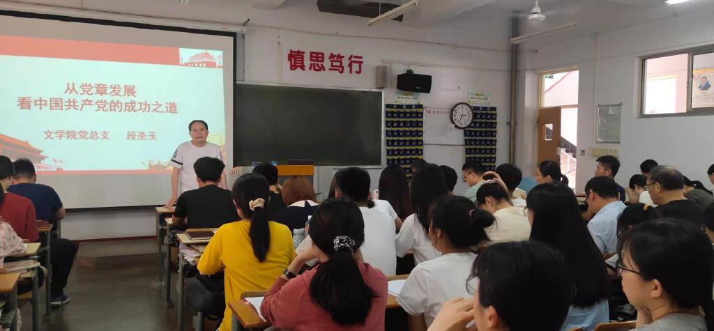 6月16日下午,文学院于文科楼317教室开展“从党章发展看中国共产党的成功之道”专题党课学习活动,本次党课由文学院党总支书记宋建修主持,文学院副院长段圣玉主讲,文学院全体师生党员到场参加。