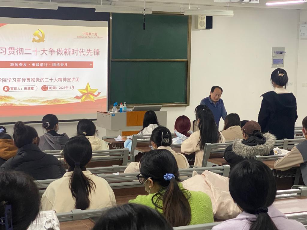 11月20日下午,文学院党的二十大精神宣讲会在新城校区增信楼3418室举行,院党总支书记宋建修为党员干部和学生代表讲“第一课”。
