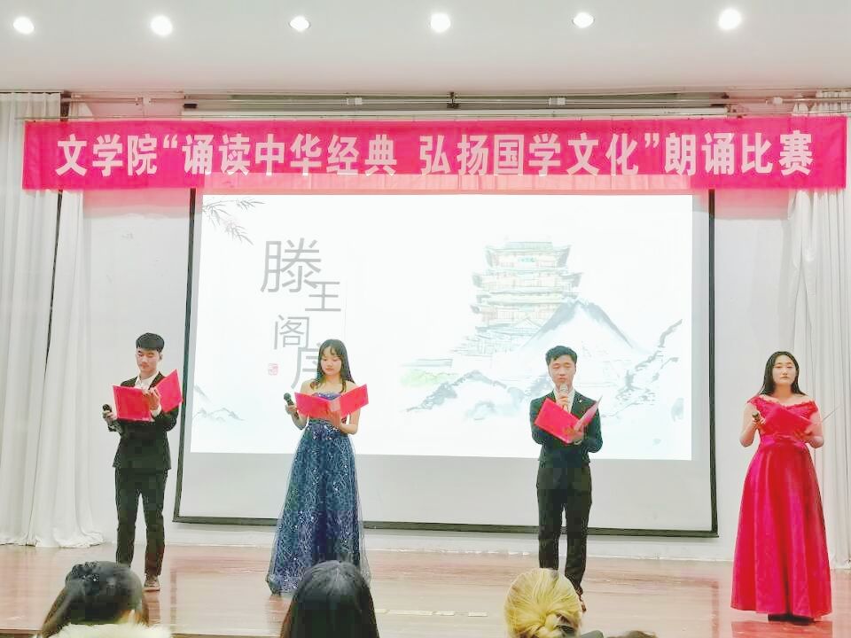 为弘扬中华民族优秀传统文化,陶冶学生艺术情操,文学院于11月24日晚在文科楼报告厅举行“诵读中华经典,弘扬国学文化”朗诵比赛。此次比赛由文学院团总支主办,文学院学生会、蓝风诗语社、南离播音主持社等承办。