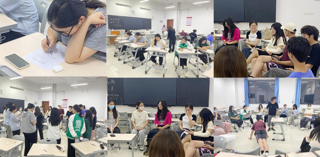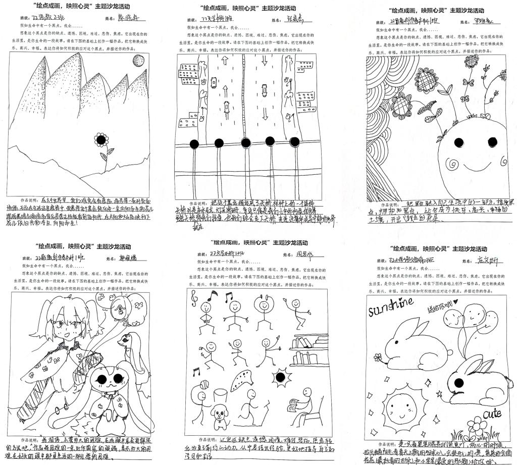 本次活动,我院从2021、2022级抽取部分不同性格的同学,以“假如生命中有一个黑点,它们代表缺点、遗憾等,如何在此基础上,转换成快乐与幸福”为题,在舒缓的背景音乐下同学们以自己的所思所想所悟进行创作,通过点线面等艺术表现形式将思想具象化到纸面上。在互动环节中,同学们通过分享彼此画作的创作理念,更好的了解了性格迥异同学们的多角度思维方式,更多面化的认识了自己。正如同学们的作品中所述“走过阻碍前行悲伤难过的天桥,我们终会走进向往的宁静或繁华的世界。”