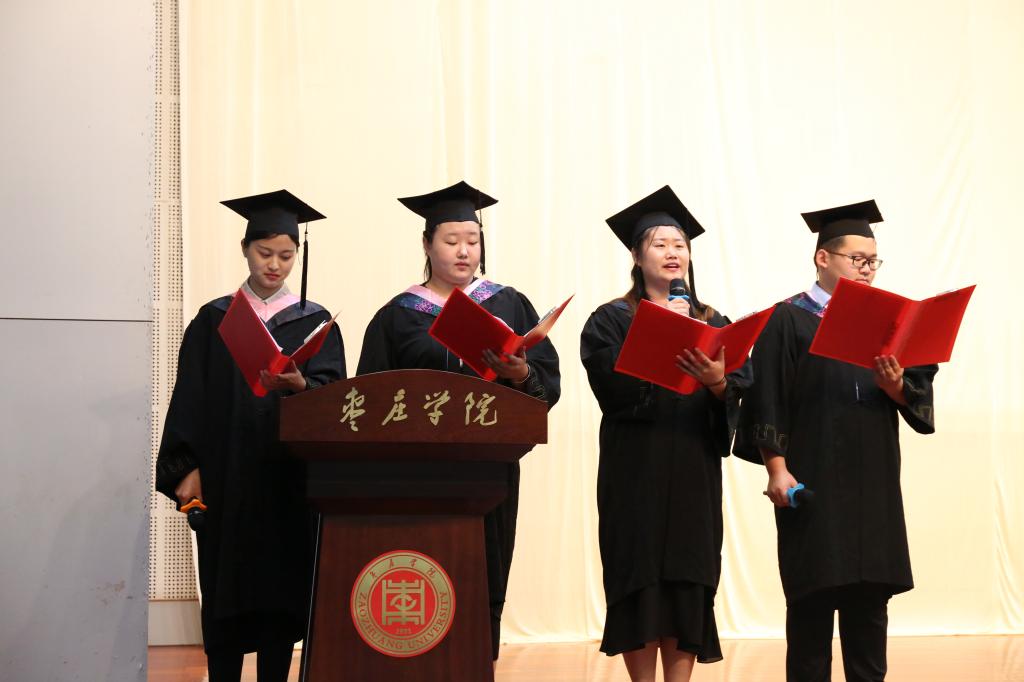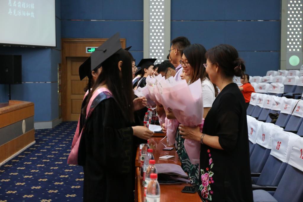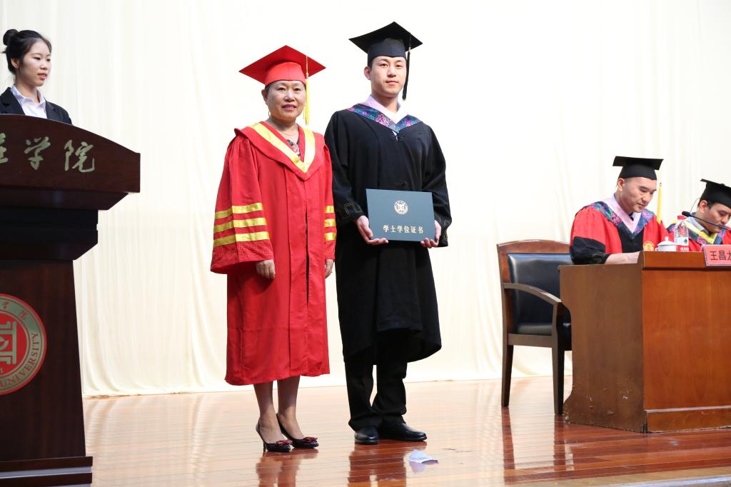 典礼在庄严的国歌奏唱中拉开序幕。在段圣玉宣读了《万象城娱乐awc线路关于授予李春萌等138名文学院2019届普通全日制本科毕业生学士学位的决定》后,李丽清亲自为全体本科毕业生一一拨穗并颁发学士学位证书,合影留念并送上祝福。随后,毕业生代表以诗歌朗诵的形式,饱含深情地感恩母校,感激恩师,祝福同学,展望未来。毕业生为教师代表送上美丽的鲜花,表达对老师的崇高敬礼。李思华老师代表全体老师为毕业生送上了殷切嘱托和深情祝福,希望同学们始终保持一份痴气、傲气与和气,向着自己的目标扬帆远航。最后,史大丰代表文学院向圆满完成学业的360名毕业生表示最热烈的祝贺和诚挚的感谢,并希望他们始终坚持理想,保持年轻人的激情和信念,不忘初心、砥砺奋斗,前程似锦、鹏程万里。