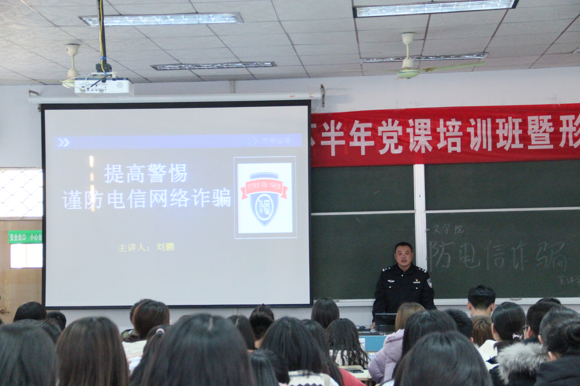 为使同学们熟悉生活中常见的诈骗形式,增强同学们的安全防范意识。文学院于12月4日在文科楼217教室举办防电信诈骗宣讲会。本次宣讲会由渴口派出所刘鹏警官主讲,18、19级部分学生到会聆听。