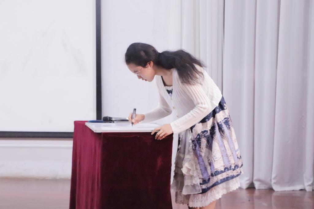 比赛现场古韵萦绕,诗香阵阵。来自10个学院的10位决赛选手进行了“识诗句,对诗文”、“单项选择题”、“飞花令”三个环节的精彩比拼。第一环节“识诗句,对诗文”,10位选手依次上台在白板上做答,和同学们共同品味古典诗词的唯美意蕴。第二环节“单项选择题”,以选择题的形式,要求选手进行从诗人到作品的知识转换,考察了选手们的临场反应能力和诗词底蕴。第三环节“飞花令”,三三分组围绕大屏幕上的意象说出相关诗句,这不仅是一场诗词储备的比拼,更是心理素质的较量。最终来自政治与社会发展学院的鲁忠云摘得桂冠,来自文学院的王坦等三名选手获得二等奖。