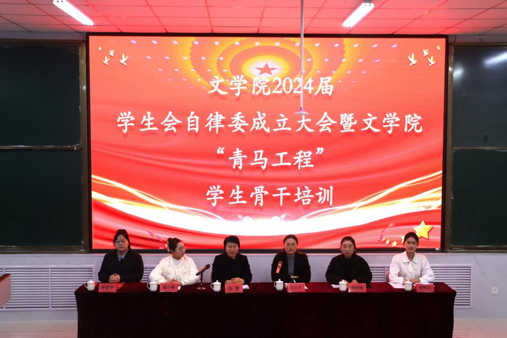 为进一步加强学生干部团队的思想建设,提升学生干部的综合素质。11月26日晚,文学院于增信楼211室举办2024届学生会自律委成立大会暨“青马工程”学生骨干培训。党委副书记华莹、辅导员杨晓雅、赵小倩出席,200余名学生骨干参加,会议由文学院团委书记、学工办主任王元元主持。