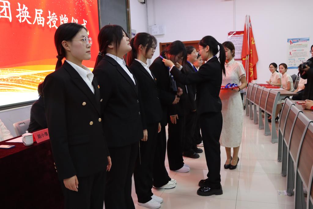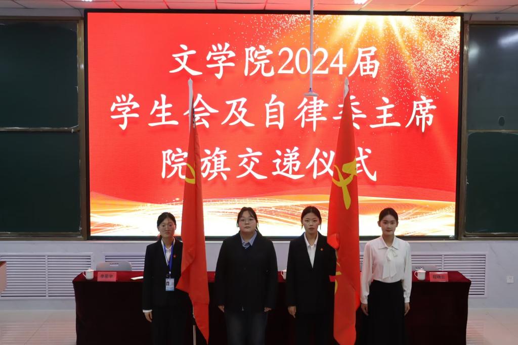 会上,杨晓雅、赵小倩分别宣读《文学院2024届学生会成员名单》和《文学院2024届自律委成员名单》,依次为新一届学生干部颁发聘书,2023届主席与新任主席进行院旗交接仪式,新任学生会、自律委主席团与各部部长进行挂牌,新任主席乔玥、马莹对过去的工作表示肯定,并强调之后在工作中会脚踏实地,锐意进取,再创文院佳绩。