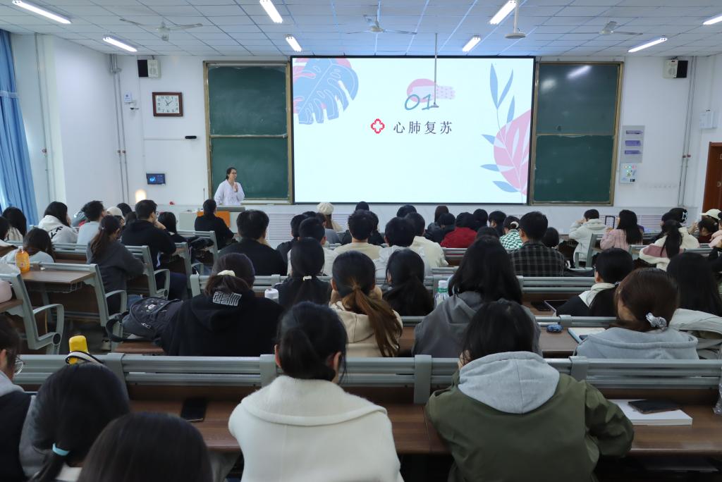 刘祥艳通过理论讲解、视频教学、现场实操等方式进行培训。她利用人体模型,为学生演示心肺复苏技能:如何评估周围环境、判断病人意识、向现场其他人员求助、拨打120的正确方式、按压位置频率,开放气道、人工呼吸操作方法以及如何判断有效指标。在心肺复苏之后,又教授了气道异物梗阻时如何使用海姆立克的自救互救方法等,内容丰富,重点突出,学生们学习兴趣浓厚。