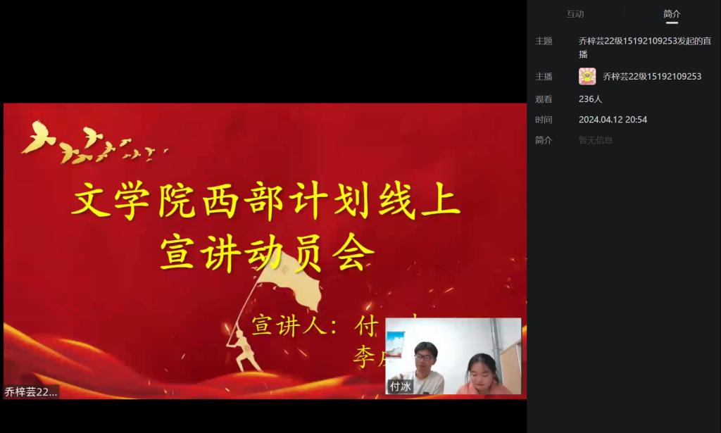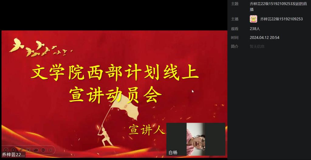 为全面贯彻落实国家援建西部的号召,做好西部计划宣传招募工作,2024年4月12日,文学院召开“青春为疆来”西部计划云宣讲会,共计200余人参加。