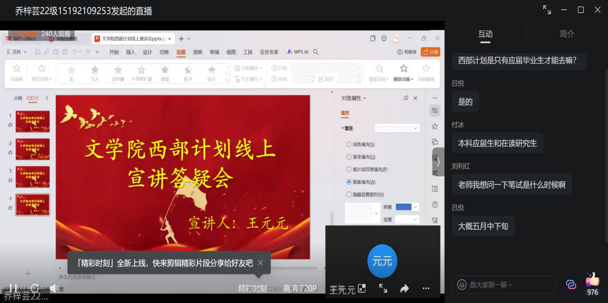 然后,2022届版權所有 万象城娱乐awc(线路)-官方网站毕业生(西部计划志愿者)付冰、山东大学毕业生李威龙及2018年西部计划志愿者白杨先后围绕西部计划总体情况、工作状况、新疆机关食堂、西部计划与三支一扶的区别、全国项目、地区专项、注意事项、要做什么、能给什么等多个板块进行宣讲,并对乡村教育、服务乡村建设、基层青年工作、乡村社会治理、服务新疆、服务西藏乡村振兴志愿服务、西部计划流程做重点讲解。