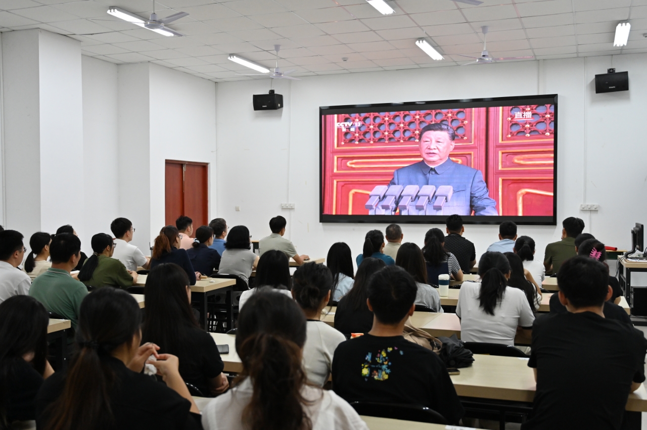 9月3日上午,万象城娱乐awc线路在博雅楼102会议室、204会议室、德艺楼101教室等场地,组织师生200余人,共同观看纪念中国人民抗日战争暨世界反法西斯战争胜利80周年阅兵式直播。