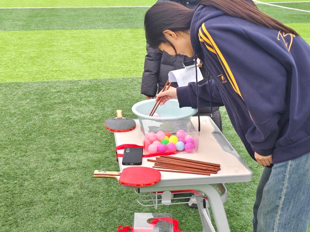 运动会共设三大特色赛道,全面考验各参赛队伍的综合能力。“默契协作接力赛”要求队员依次完成乒乓球拍运球、筷子夹球入箱和背负晃球出洞等环节,任何细微失误都可能影响全局,极大考验团队的默契与稳定。“宿舍默契挑战赛”以宿舍为单位,设置双腿夹纸跳跃、背靠背运排球和定点投篮等项目,有效增进室友之间的协调与信任,让同窗情谊在协作中升温。“团队接力障碍赛”则融入大象转圈、头顶运送气球等多重挑战,既考验体力分配,也强调策略运用,充分彰显团队协作在应对复杂任务时的核心作用。各项目兼具趣味性与教育意义,现场气氛热烈欢快。