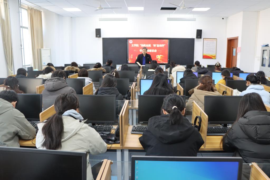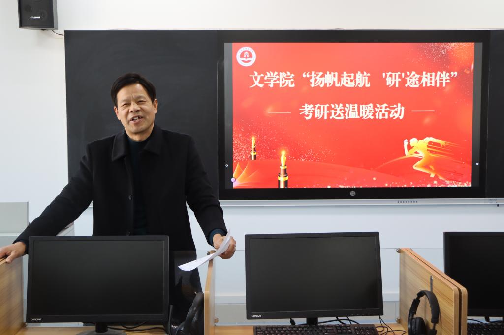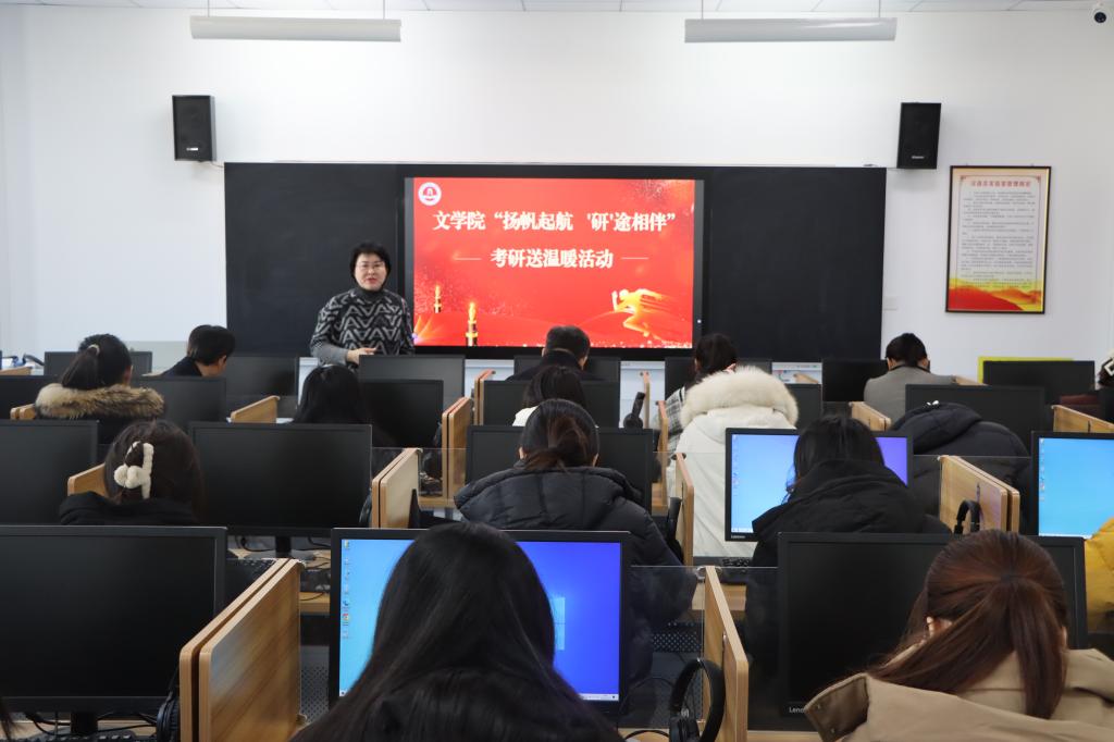 2025年考研即将到来,为了给紧张备考的学生加油鼓劲,传递学院对学生的关心和关爱,文学院于12月17日在豁然楼A416室开展“扬帆起航,‘研’途相伴”2025届考研送温暖活动。学院党委书记宋明峰、院长张爱民、党委副书记华莹、全体辅导员及2025届考研学生参加活动。