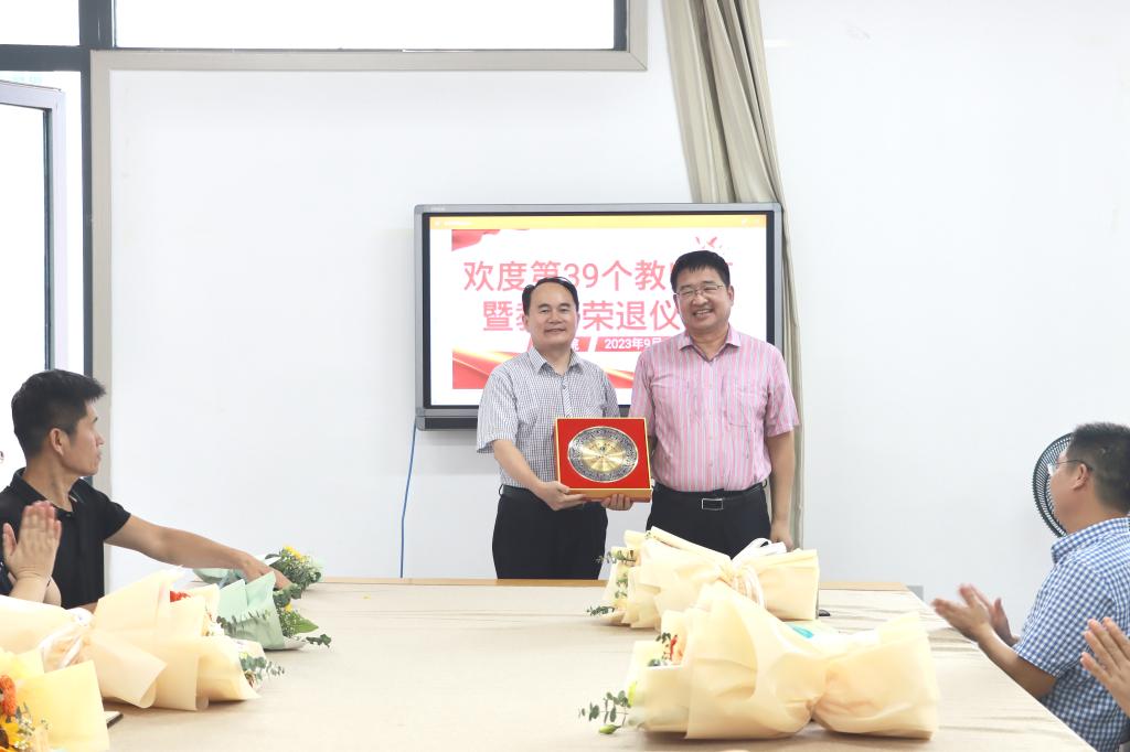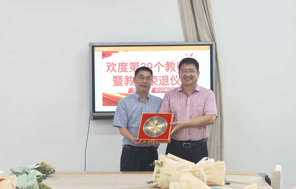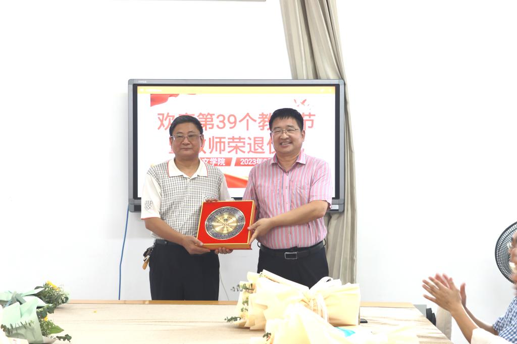 张爱民、宋建修为即将荣退的曹新伟教师和年满30年教龄的教师颁发纪念品。张爱民代表学院向全体教职员工致以节日的问候和崇高的敬意,他回顾了文学院46年筚路蓝缕的发展历程,肯定了退休教师30多年来为学院发展做出的突出贡献,对退休教师表达了感谢和不舍之情,并希望退休后能够继续支持学院事业发展。