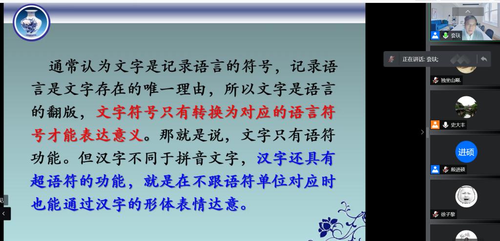随后,李运富教授强调,汉字的超语符功能是由它的来源和结构特点决定的。他指出,起源阶段字符跟语符的不对应性以及字形表达事物的相似原则,影响人们理解和使用汉字。同时,汉字的平面组合性结构特点为发挥汉字的超语符功能提供可能性。最后,李运富教授与在线师生就本次课题的相关问题进行了互动交流。
