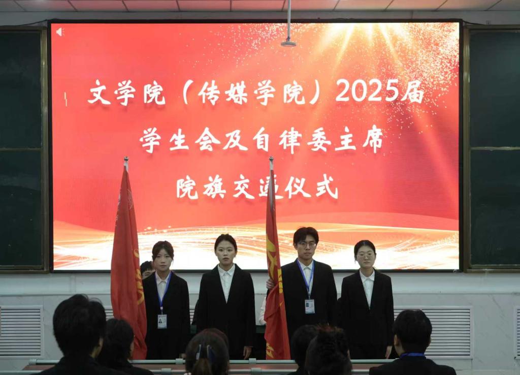 大会首先宣读了新一届学生会及自律委成员名单。随后,2024届学生会主席为新任主席团成员授牌,新任学生会主席与自律委主席共同为各部门新任部长颁发胸牌。此次授牌不仅传递了学生会的责任与使命,更承载着学院对新一届学生干部的殷切期许。大会进行庄重的院旗交接,2024届学生会主席和自律委主席将院旗传递给新任主席,寓意着学生工作精神与担当的薪火相传。2024届自律委主席发言,分享工作心得并对新一届团队寄予美好祝愿;2025届学生会主席表态发言,承诺将恪尽职守,全心全意为同学服务。