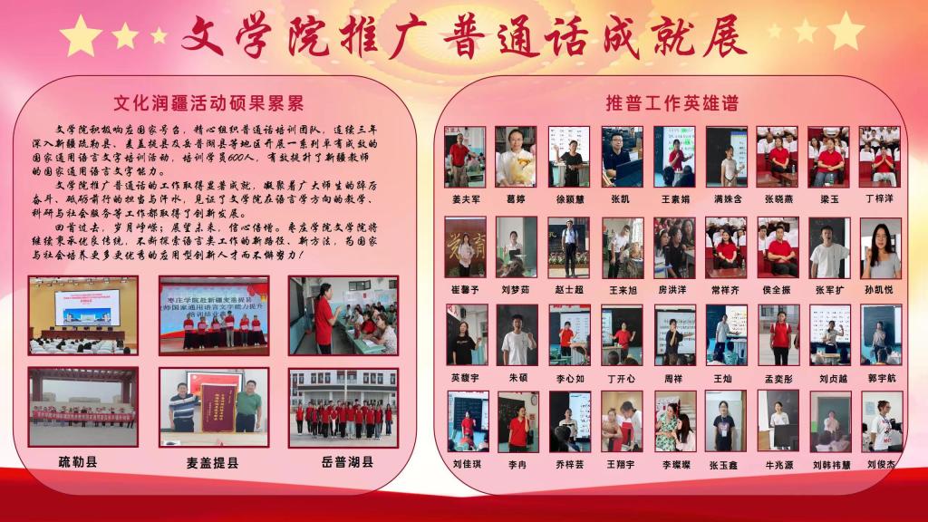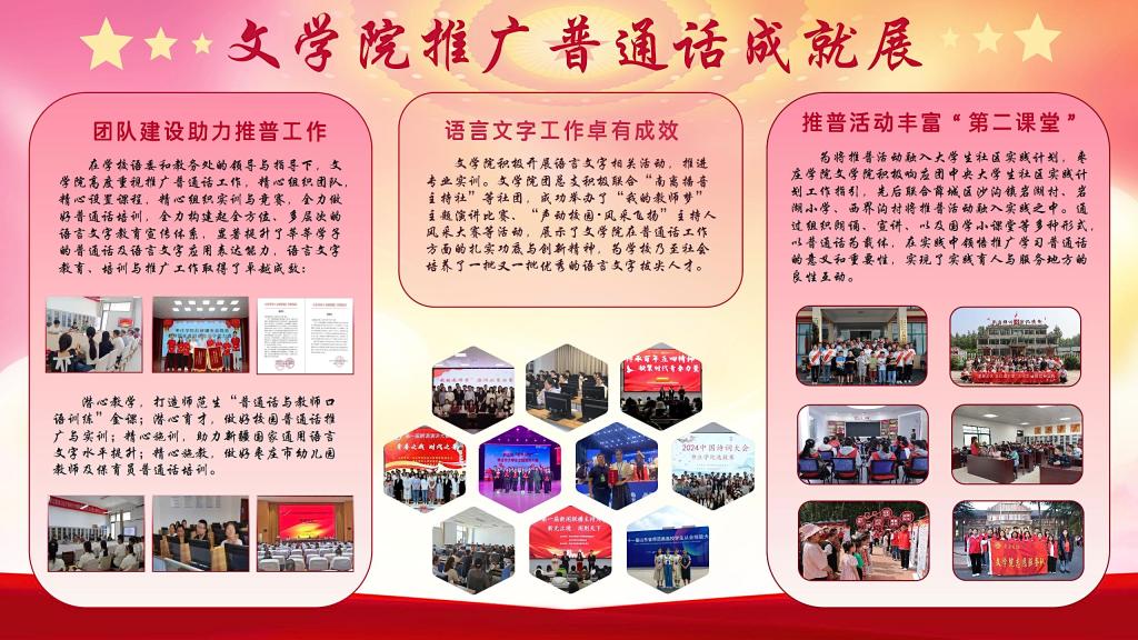9月19日,文学院在学校语委会和教务处的指导下,成功举办了推广普通话成就展。此次展览全面展示了文学院在语言文字工作方面取得的成就,特别是在推广普通话方面所做出的积极贡献。