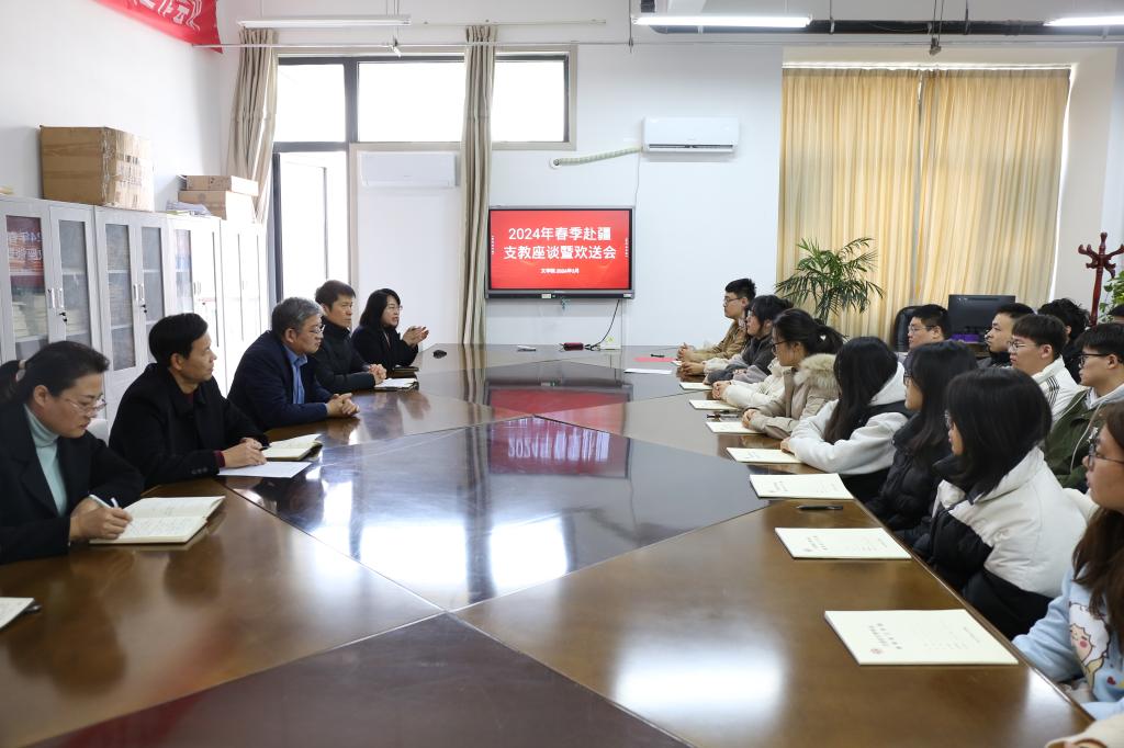 3月6日上午,文学院在豁然楼B310室召开2024年春季援疆支教师生座谈会,学院党政领导、辅导员老师及本次赴疆支教的全体学生参加了座谈会。会议由文学院副院长段圣玉主持。