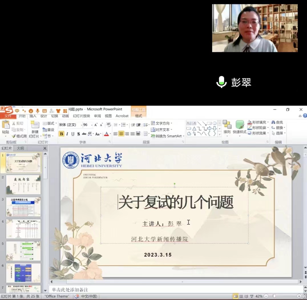 为扎实推进2023届毕业生考研复试指导工作,3月15日下午,文学院在新城校区豁然楼A214室开展线上考研复试指导专题讲座。本次讲座邀请河北大学新闻传播院彭翠老师线上主讲,由文学院副院长段圣玉主持。