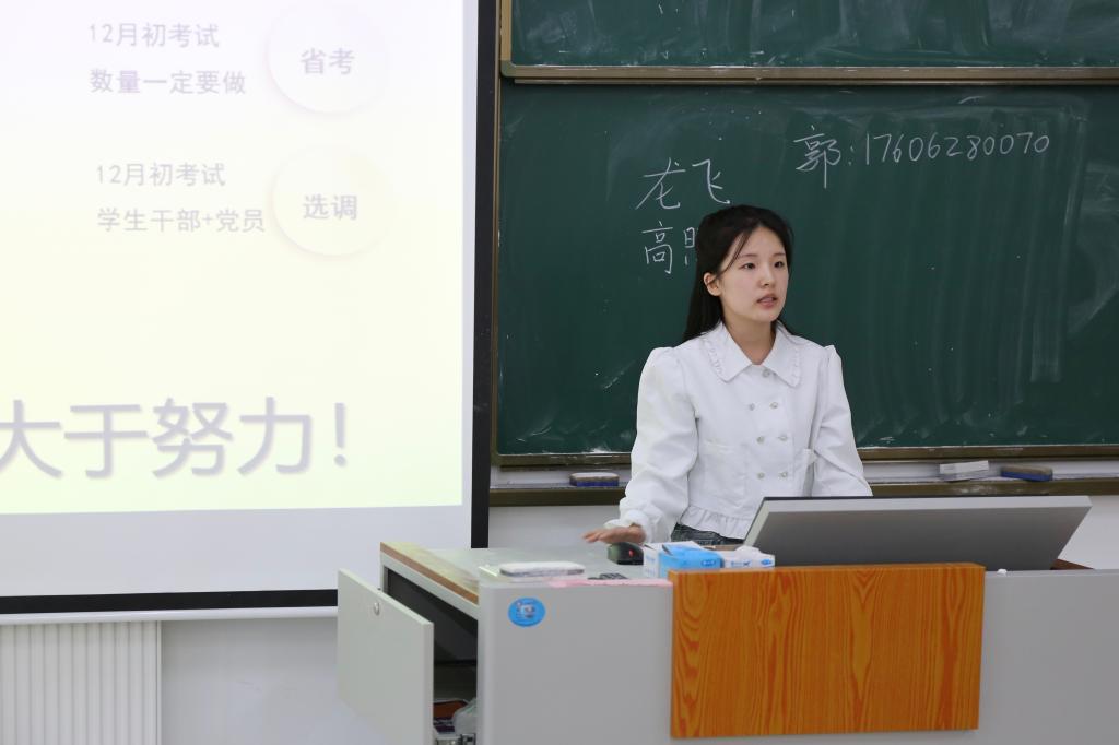 郭润泽结合自身公务员考试的成功经验,从考试内容、学习资料选择、面试准备、考试技巧等方面展开分享。刘姝妍重点分析适合同学们报考的岗位,建议同学们及时关注时政热点,多读评论员文章,以提高自己的申论写作能力。李俊彦则针对行测和申论中各个模块的复习方法和答题技巧给出建议,强调认真备考的重要性,激励大家踏踏实实地完成自己制定的备考计划。王华勇分析了文学类专业在公务员考试中的优点和弱势,鼓励同学们要坚定信念、扎实准备,学好专业知识,增强个人竞争力,努力应对各种挑战。