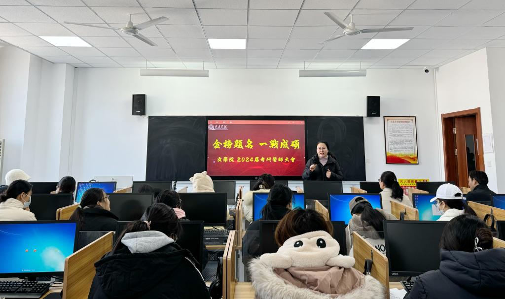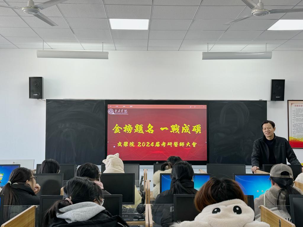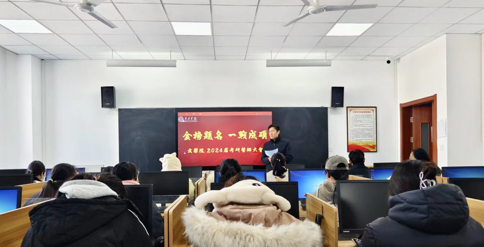 为进一步激发学生考研斗志,舒缓临考压力,12月21日上午,文学院于豁然楼A416教室召开2024届硕士研究生考前动员大会。本次大会由学院党总支副书记华莹主持,学院党总支书记宋明峰、副院长段圣玉,全体辅导员和全体考研学生参加了大会。