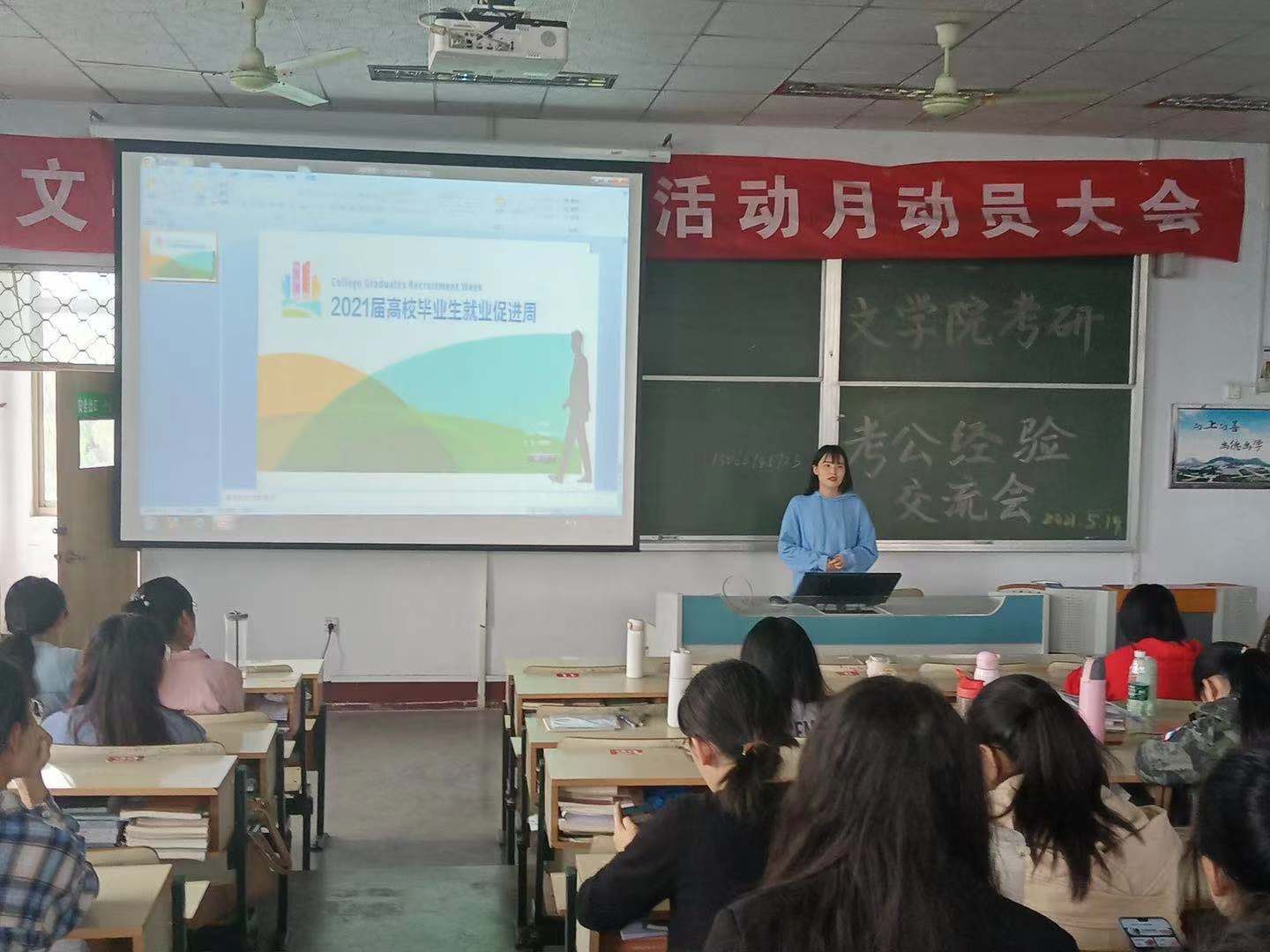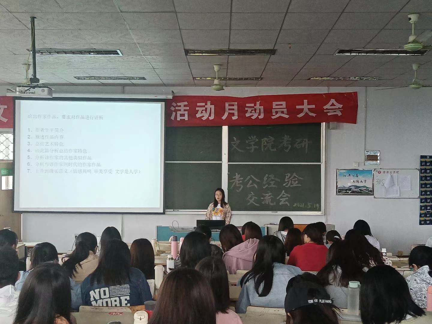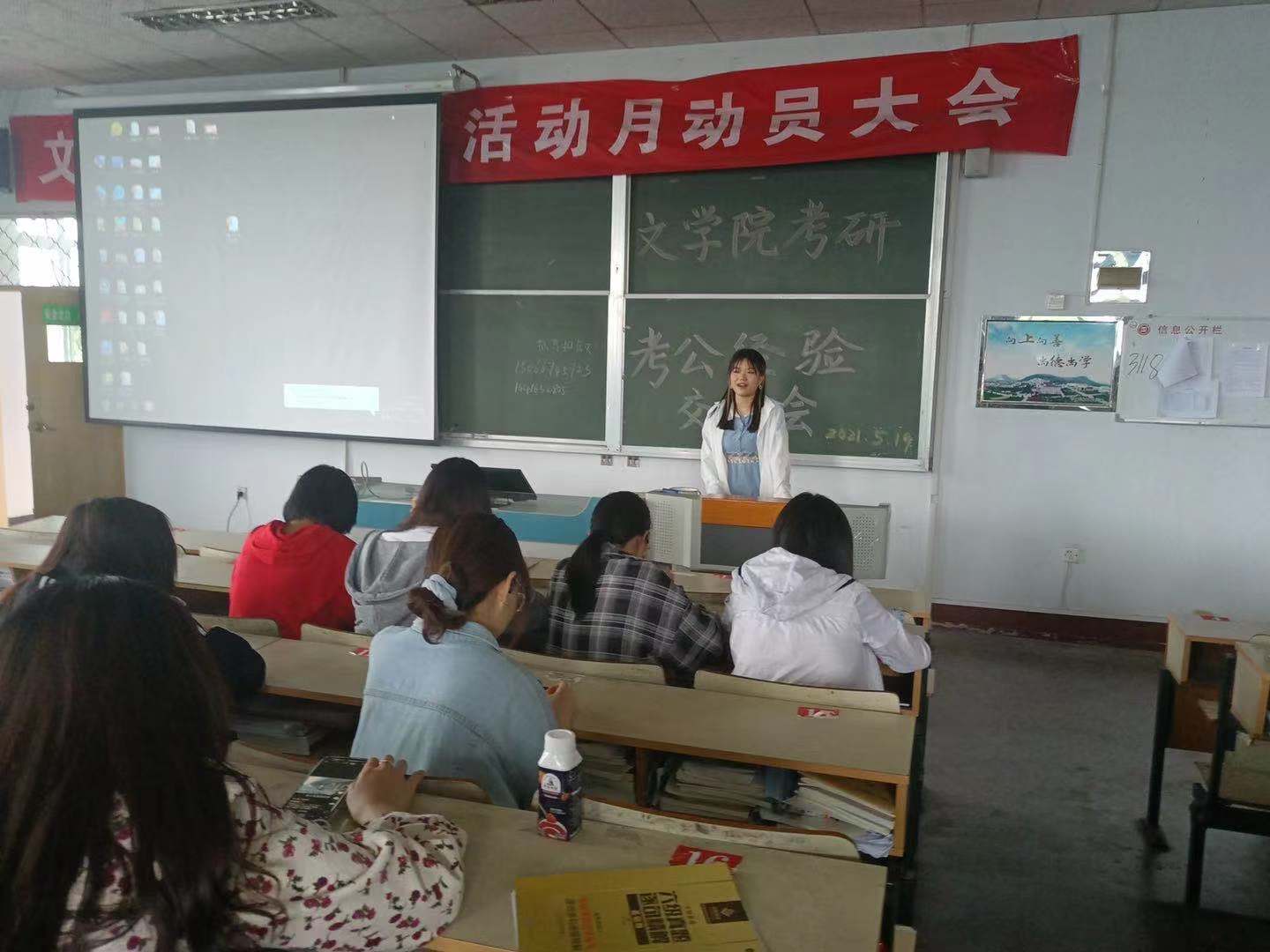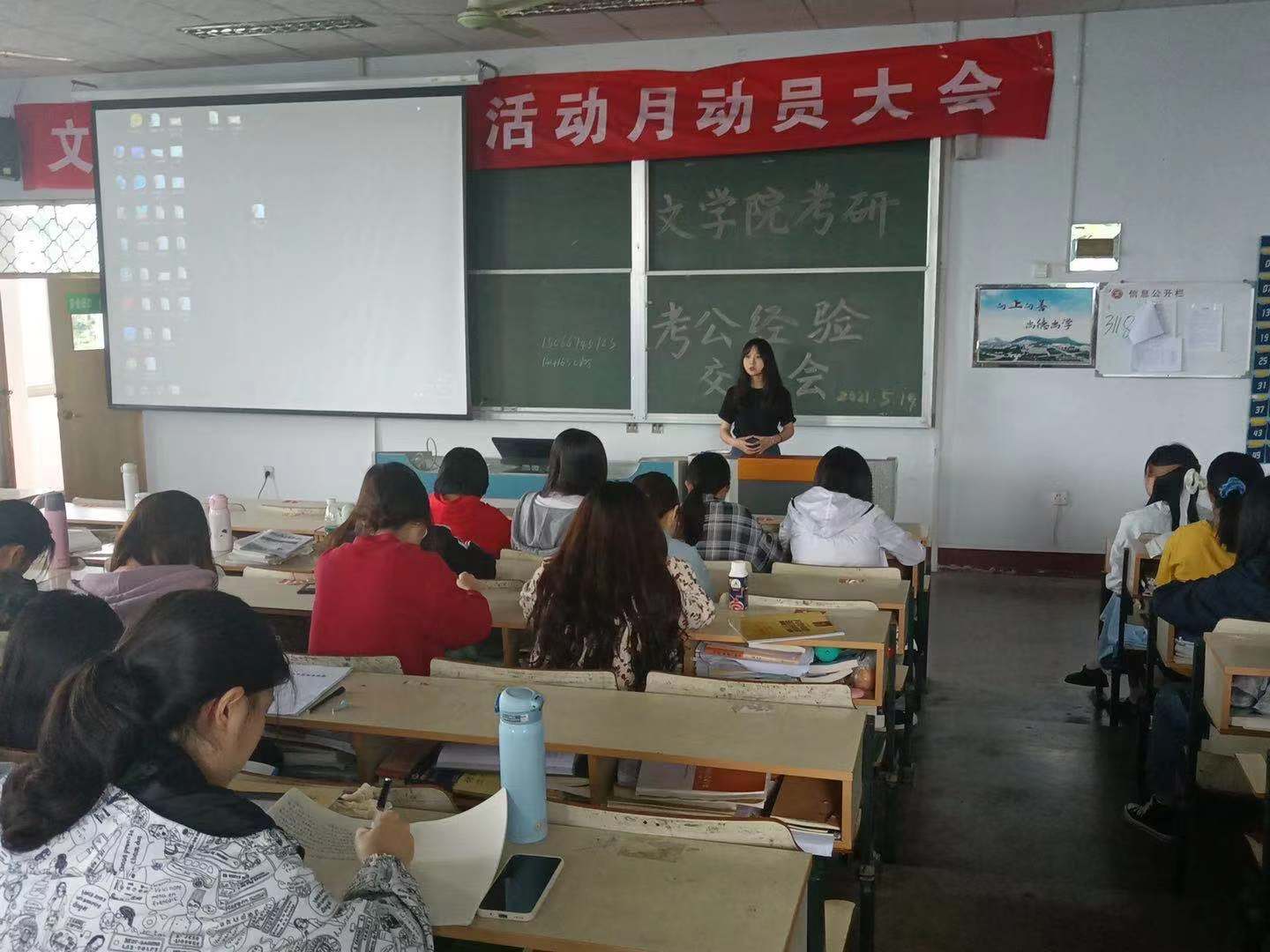 5月19日下午,文学院于文科楼217教室举办考研考公经验交流会,交流会邀请了我院2021届优秀学子许文雪、李会茹、周璇、关俊喜主讲,文学院200余名学生到场参加。